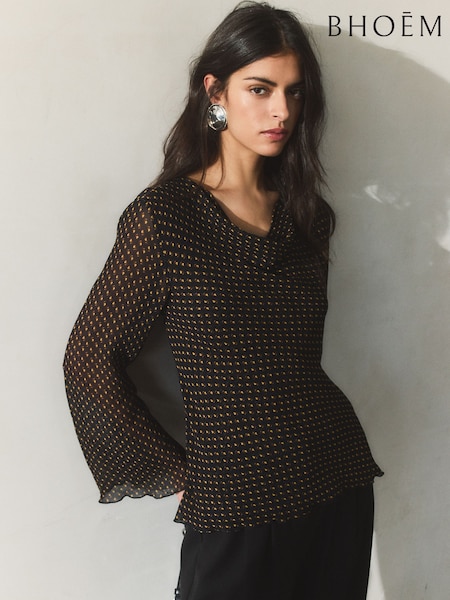 BHOEM Shawl Collar Micro Print Flowy Black Blouse