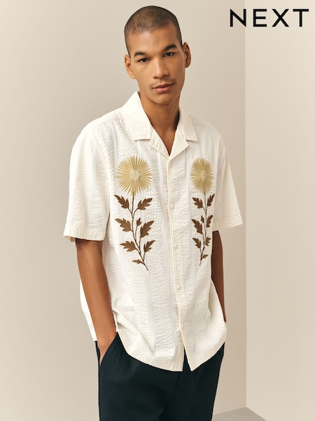 Neutral Textured Embroidered Floral Short Sleeve Shirt