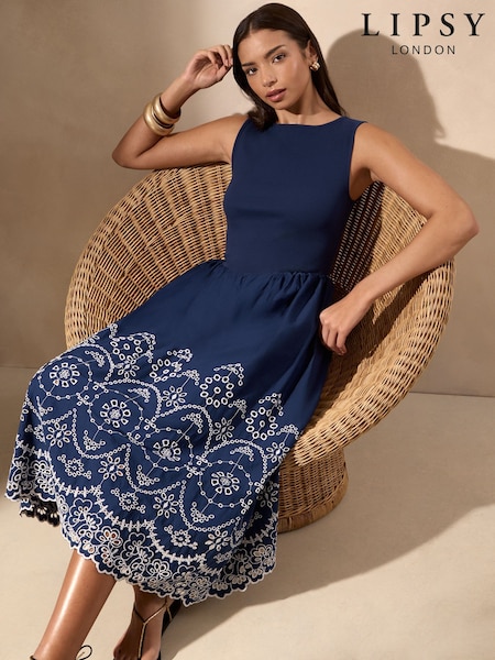 Lipsy Navy Sleeveless Broderie Hybrid Midi Dress