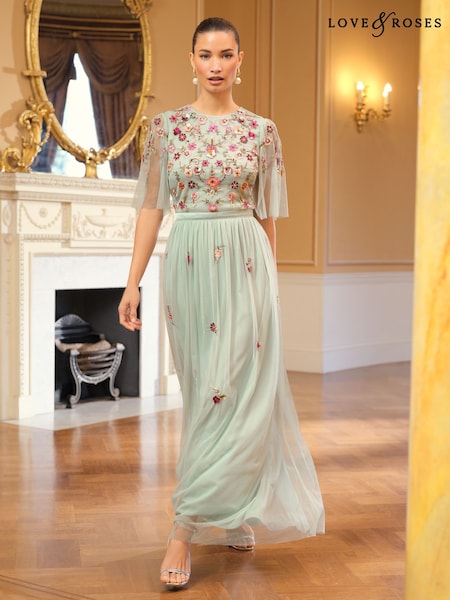 Love & Roses Mint Green Embroidered Angel Sleeve Maxi Dress