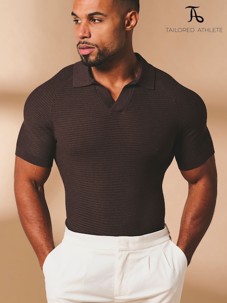 Tailored Athlete Brown Muscle Fit Textured Knitted Open Collar Polo Shirt