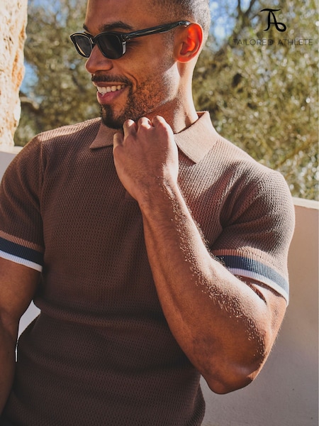 Tailored Athlete Brown Muscle Fit Colour Block Tipped Crochet Knit Polo Shirt