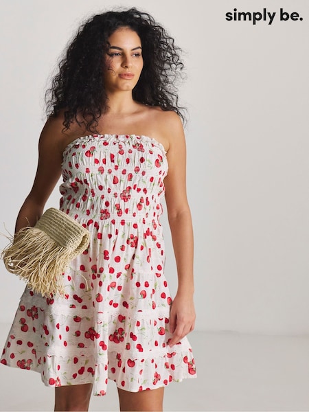 Simply Be White Cherry Print Shirred Bandeau Beach Dress