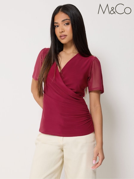M&Co Red Petite Mesh Short Sleeve Wrap Top