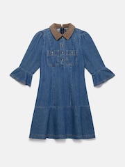 Blue denim shirt dress in a mini silhouette featuring a corduroy collar, button down chest pockets, 3/4 length sleeves, fluted cuffs, button closure through the front and a zip fastening through the back. Machine washable. 100% Cotton.