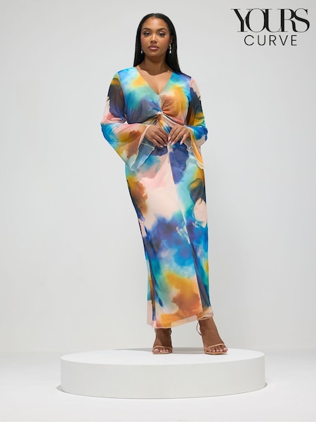 Floral azul azul marino - Vestido largo y plisado con cuello en pico y estampado de malla para ocasiones especiales