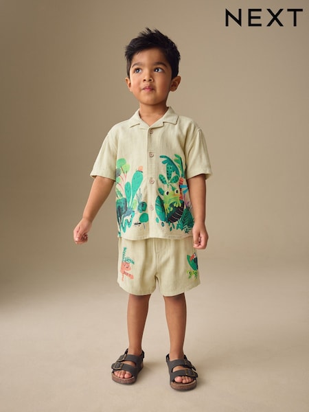 Light Green Jungle Print - Conjunto de camisa de manga corta con cuello de solapa y pantalones cortos (3 meses-10 años)