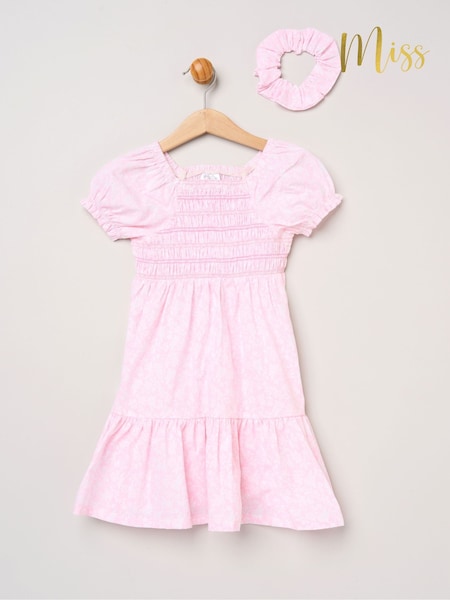 Miss Floral Smocked Embroidery Dress With Matching Scrunchie Set