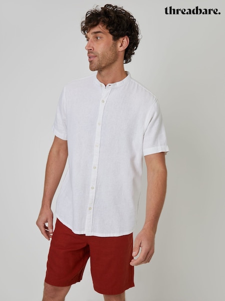 Blanco - Camisa de manga corta en mezcla de lino con cuello mao de Threadbare
