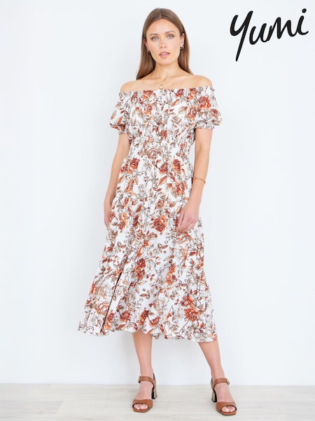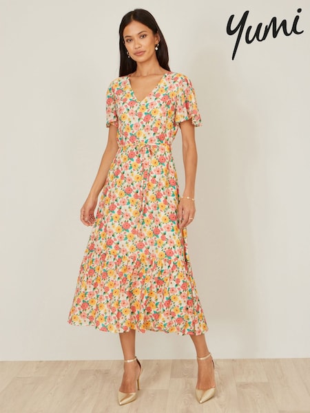 Yumi Floral Ruched Waist Midi Dress