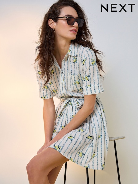 Crudo/Estampado floral amarillo - Short Sleeve Tie Waist Shirt Dress