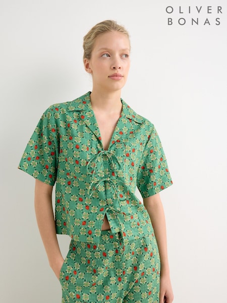 Oliver Bonas Green Strawberry V-Neck Tie Front Blouse