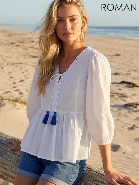Roman Tassel Tie Front Blouse