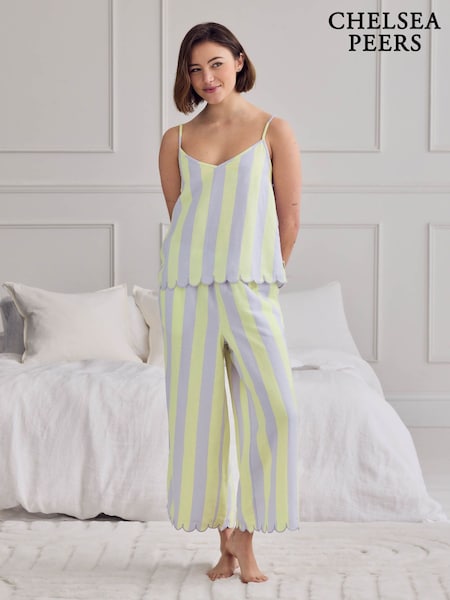 Chelsea Peers Linen Blend Scallop Edge Stripe Long Pyjamas Set